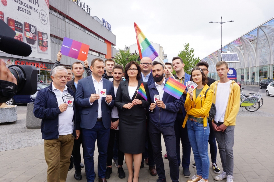 Politycy Lewicy przygotowali specjalne naklejki "Strefa wolna od nienawiści", które rozdawali przechodniom podczas wtorkowej akcji w Łodzi. Podkreślali przy tym, że to nie Marsze Równości są problemem, tylko zgoda prawicy na przemoc i agresję wobec mniejszości i nienawiść do tej społeczności, podsycana przez rząd i polityków PiS.